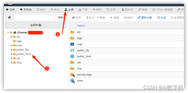 cPanel面板的网站根目录是/public_html,所以进到文件管理器之后选择该目录,再点击上传: