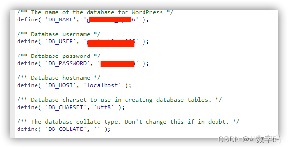 分别将“DB_NAME”(数据库名)、“DB_USER”(数据库用户)和“DB_PASSWORD”(数据库密码)更改为刚刚创建的数据库的信息