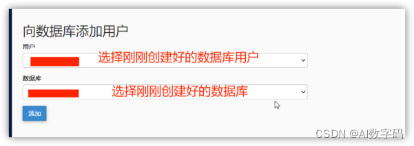 数据库和数据库用户都创建完成之后,向数据库添加用户,选择好对应的数据库用户和数据库,点击“添加”: