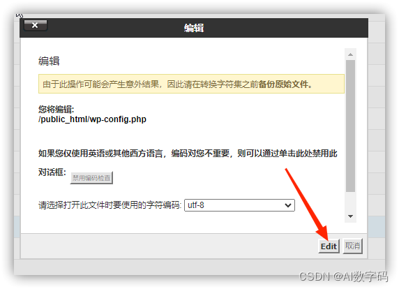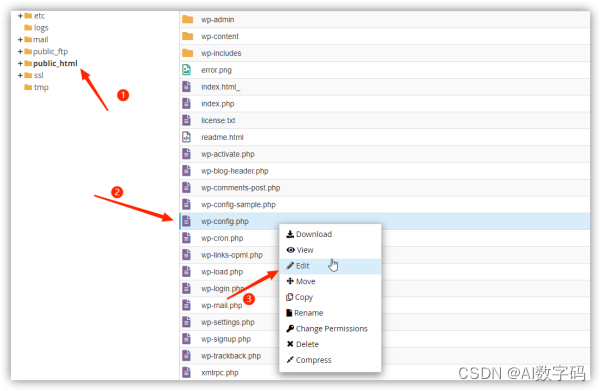 这一步我们可以直接通过文件管理器来完成,WordPress的数据库链接文件为wp-config.php,我们回到文件管理器,在/public_html下找到这个文件,右键点击编辑: