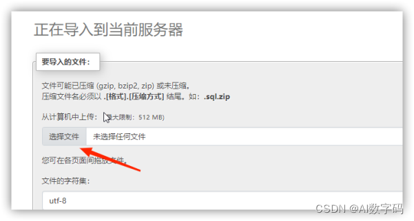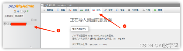 打开phpMyAdmin之后,在左侧列表中选择刚刚创建好的数据库,然后点击顶部的导入选项卡,如图: