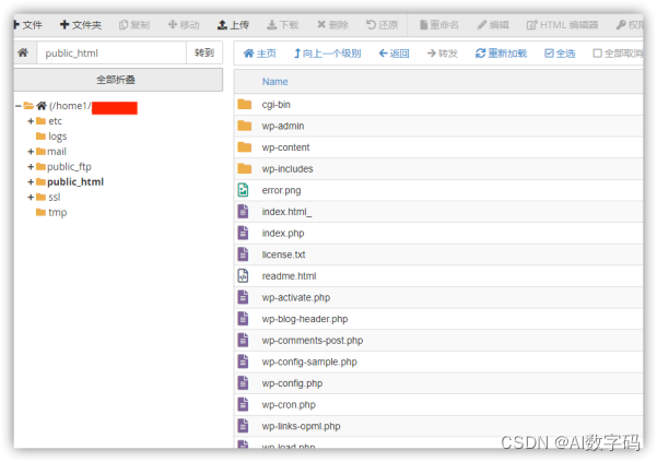cPanel面板支持在线解压,右键点击“Extra”即可解压,解压后,确保WordPress文件位于/public_html这个根目录下,如图这样: