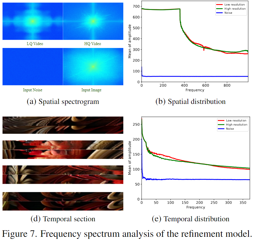 为了进一步阐明精化模型的工作机制,我们在下图7中分析了在此过程中生成的视频在频域中发生的空间和时间变化。图7a呈现了四个空间输入的频谱,揭示了低质量视频在高频范围内的频率分布与噪声相似,而高质量视频则更接近输入图像的频率分布。结合图7b中呈现的空间频率分布,可以观察到精化模型在保留低频数据的同时,对高频数据进行了更平滑的变化。从时间维度的角度看,图7d呈现了低质量视频(顶部)和高质量视频(底部)的时间轮廓,显示高清晰度视频连续性的明显改善。此外,结合图7b和图7e,可以观察到精化模型在空间和时间域中保留低频分量,减少中频分量,并增强高频分量。这表明时空领域中的人工痕迹主要存在于中频范围。