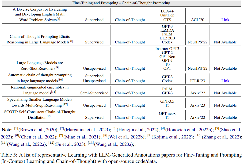 应用LLM生成的标注进行学习的代表性论文列表,用于微调和提示(上下文学习和思维链),并附有开源代码/数据