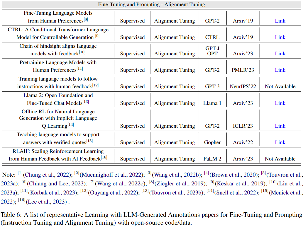 应用LLM生成的标注进行学习的代表性论文列表,用于微调和提示(指导微调和对齐微调),附有开源代码/数据