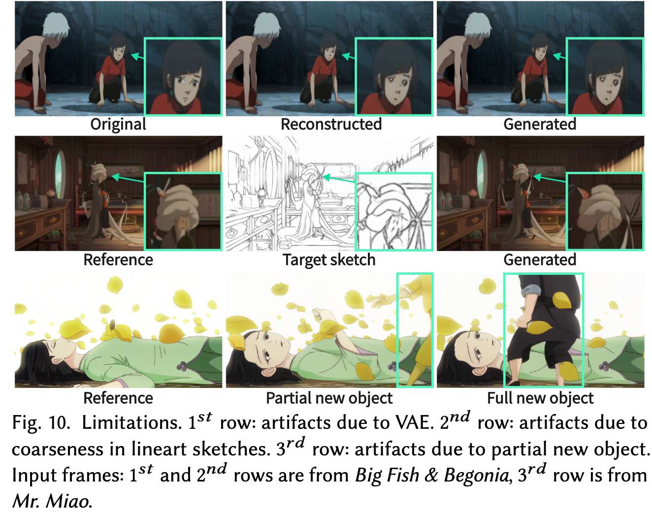 尽管本文方法有效,但存在两个局限性。首先,由于VAE的重建损失和输入草图的粗糙性,我们的方法在细节上可能会出现伪影。如图10所示,由于重建损失,第一行女孩脸部的细节丢失,而第二行老人的脸由于草图粗糙而模糊。对原始VAE进行微调以适应卡通图像领域以及我们框架中使用的分辨率,并对训练草图进行数据增强,可以缓解这个问题。另一个局限性是对部分可见新对象的上色可能不准确。如第三行所示,当新角色的部分身体进入场景时,其身体被错误地上色为附近花瓣的颜色。只有当角色的全身可见时,上色才会准确。修改我们的视频剪辑算法以包括更多涉及新对象场景变化的案例,可能会帮助我们的模型处理这种情况。