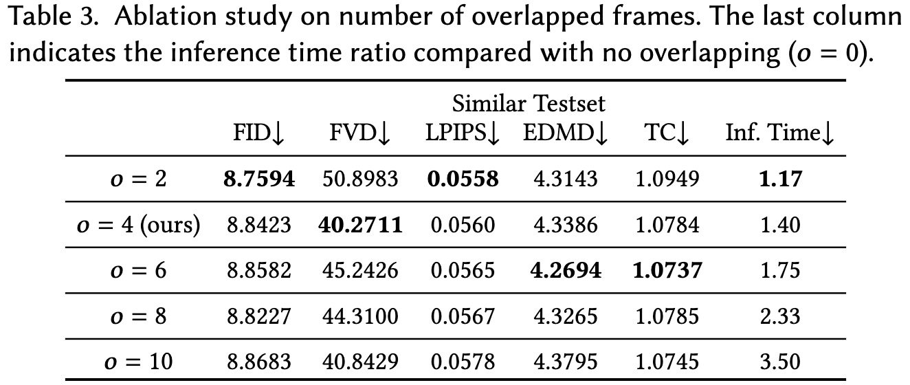 重叠帧数量的消融研究。 将视频序列划分为带有𝑜个重叠帧的段,以进行序列采样。在表3中,分析了不同数量的重叠帧。观察到,将𝑜从2增加到4显著改善了视频质量(FVD)和时间一致性(TC),而其他图像质量指标几乎保持不变。然而,进一步增加重叠帧的数量并未带来显著的改善,甚至在𝑜 = 6和𝑜 = 8时导致FVD下降,同时减慢推理速度。因此,为了平衡推理质量和速度,设置𝑜 = 4个重叠帧是最佳选择。