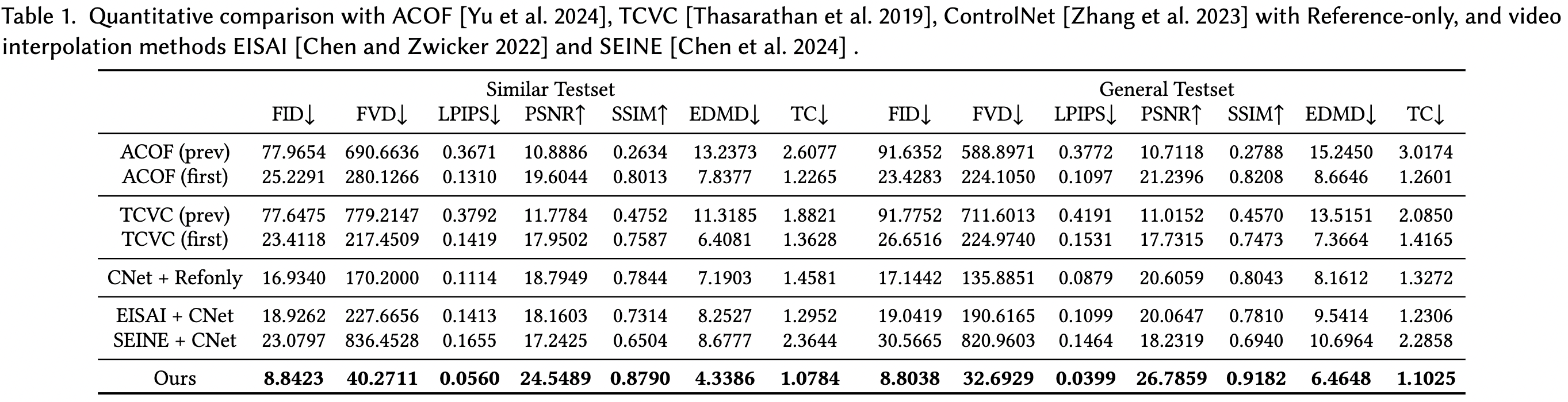 - 帧相似度:由于动画是基于线条草图和第一帧参考图像生成的,这两者均来自原始动画,我们使用PSNR、LPIPS和SSIM测量生成帧与原始动画帧之间的相似度。