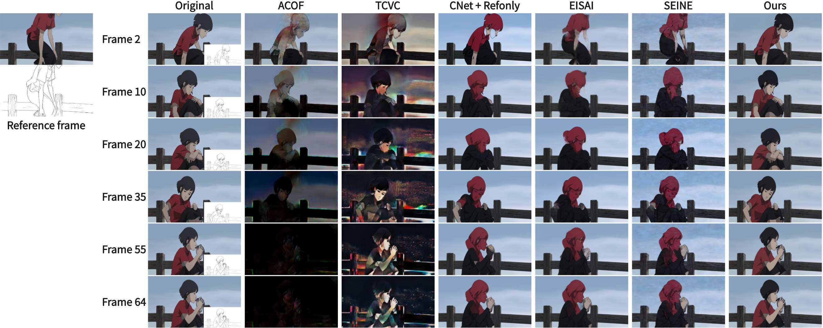 对于这两种方法,评估两个版本:原始版本Prev Sample将参考帧更新为先前生成的帧,而修改版本First Sample始终使用第一帧作为参考。考虑到我们的任务中没有基于扩散的框架,我们采用了图像ControlNet ,与AnythingV3一起使用,从Stable Image Diffusion卡通图像和线条控制中微调而来。此外,在采样过程中使用Reference-only提供参考帧作为指导。进一步选择了一项动画插值工作EISAI和一项基于扩散的视频插值工作SEINE进行比较。由于这两种方法在固定间隔内插值颜色化的参考关键帧,首先应用ControlNet + Reference-only方法为每13帧颜色化关键帧,然后应用EISAI和SEINE插值剩余帧。