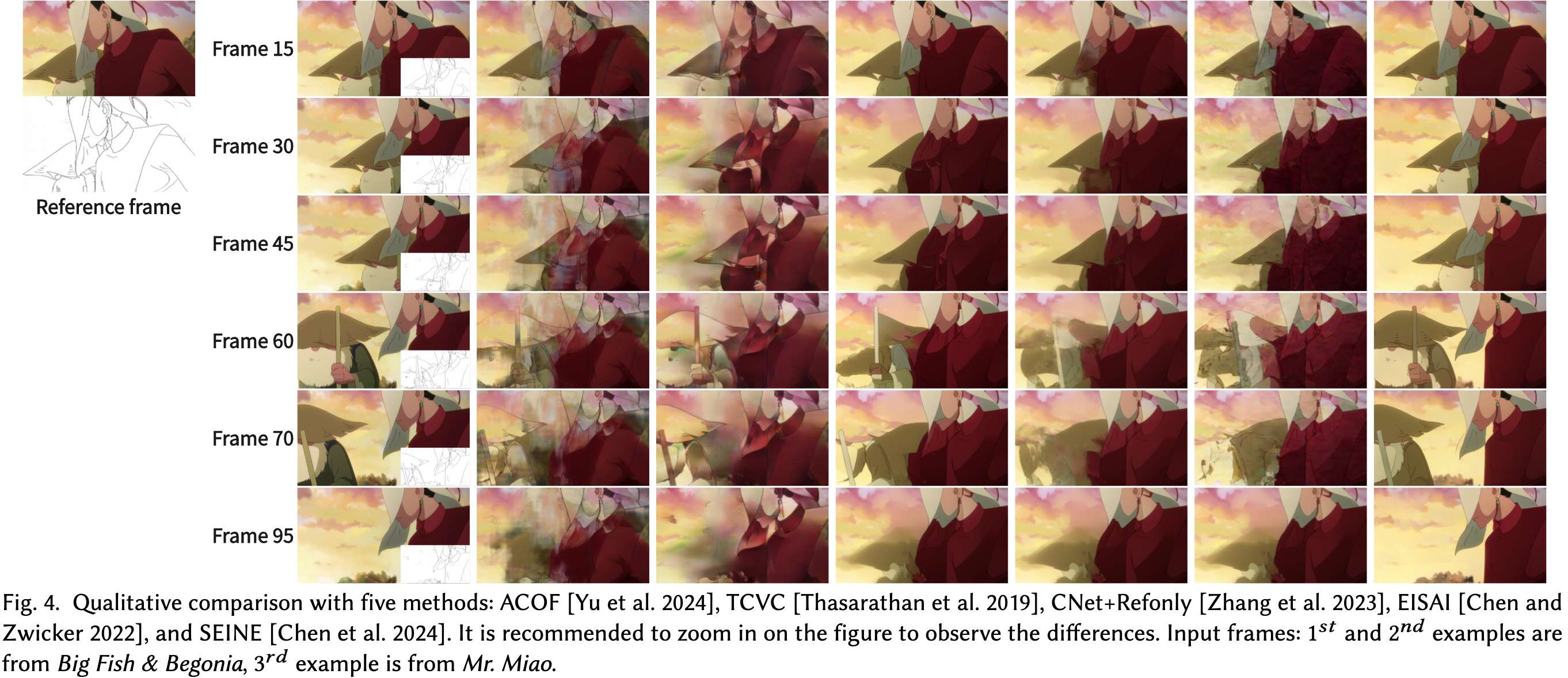 将所提方法与两个现有的基于参考的线条视频上色框架进行比较:ACOF (一种基于光流的方法)和TCVC(一种图像到图像框架),这两者都是基于GAN的图像模型。由于没有广泛接受的线条视频上色基准数据集,为确保公平比较,利用我们的数据集生成帧对,以训练ACOF和TCVC,使用它们的官方代码。