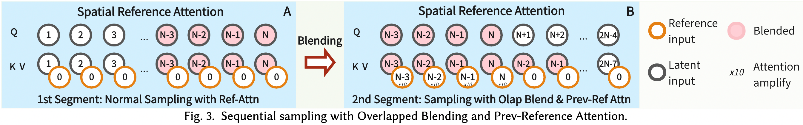 其次,通过参考注意力进一步插入先前生成帧的内容。如图 3-B 所示,我们首先将所有先前生成的重叠帧结果(在橙色块中)作为参考输入送入参考路径,以捕获来自这些输入的完整信息。然后,重叠帧的空间参考注意力定义为: