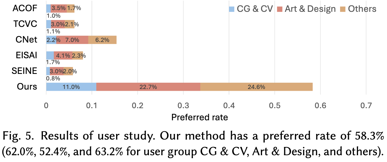 在113名参与者中,20名在计算机图形学和计算机视觉(CG & CV)领域工作或学习,49名从事艺术与设计,44名来自其他领域。如图5所示,我们的方法获得了58.3%的最高偏好率,其中CG & CV、艺术与设计和其他领域的用户偏好率分别为62.0%、52.4%和63.2%。