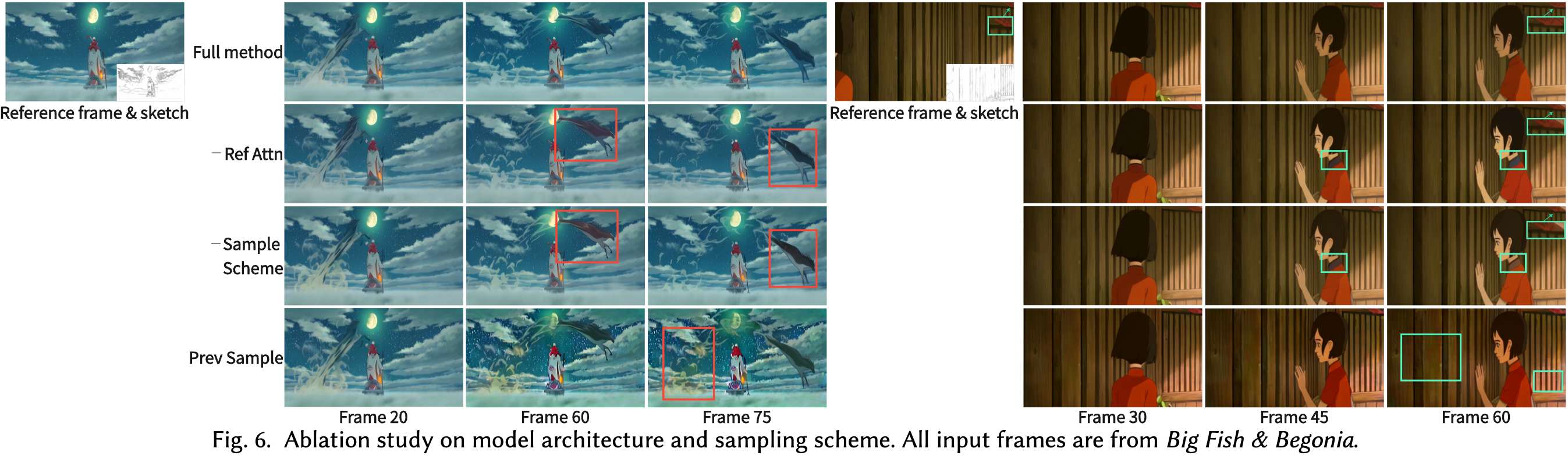 模型架构消融。 为了研究方法的效果,我们进行了消融研究,通过去除参考注意力层并使用相同的超参数重新训练网络。表2中的定量结果表明,各项指标均出现下降,显示模型处理大运动动画的能力减弱。从视觉效果来看,如图6所示,缺少参考注意力会导致显著运动区域的不一致和不正确上色,例如右侧示例中的黑色领子,以及左侧示例中鹿的颜色不一致。这些发现突显了参考注意力在增强模型生成高质量大运动动画能力方面的重要作用。