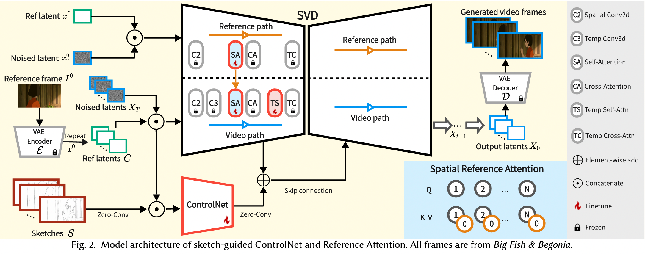 最后,使用公式 (1) 中的损失对修改后的网络进行微调,结合草图引导的 ControlNet 和参考注意力。我们更新 ControlNet 中的所有层,以及 U-Net 中的空间和时间自注意力层,如图 2 所示。