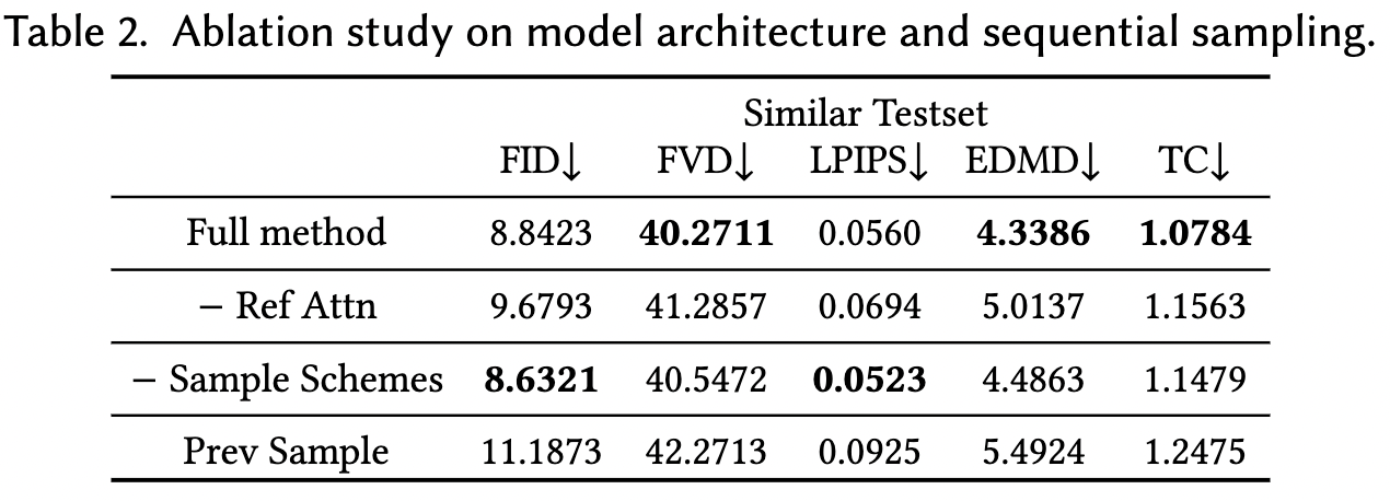 序列采样方案的消融研究。 在表2中,我们将我们的方法与两个变体进行了比较。首先,去除了前面中提到的所有采样方案,仅使用第一个参考帧进行动画采样。对于“Prev Sample”,进一步将参考切换到前一段生成的帧。定量结果显示,去除采样方案会导致时间一致性降低(TC增高),而其他指标保持相似。对于“Prev Sample”,由于使用先前生成的帧作为参考导致的累积误差,所有指标均有所下降。