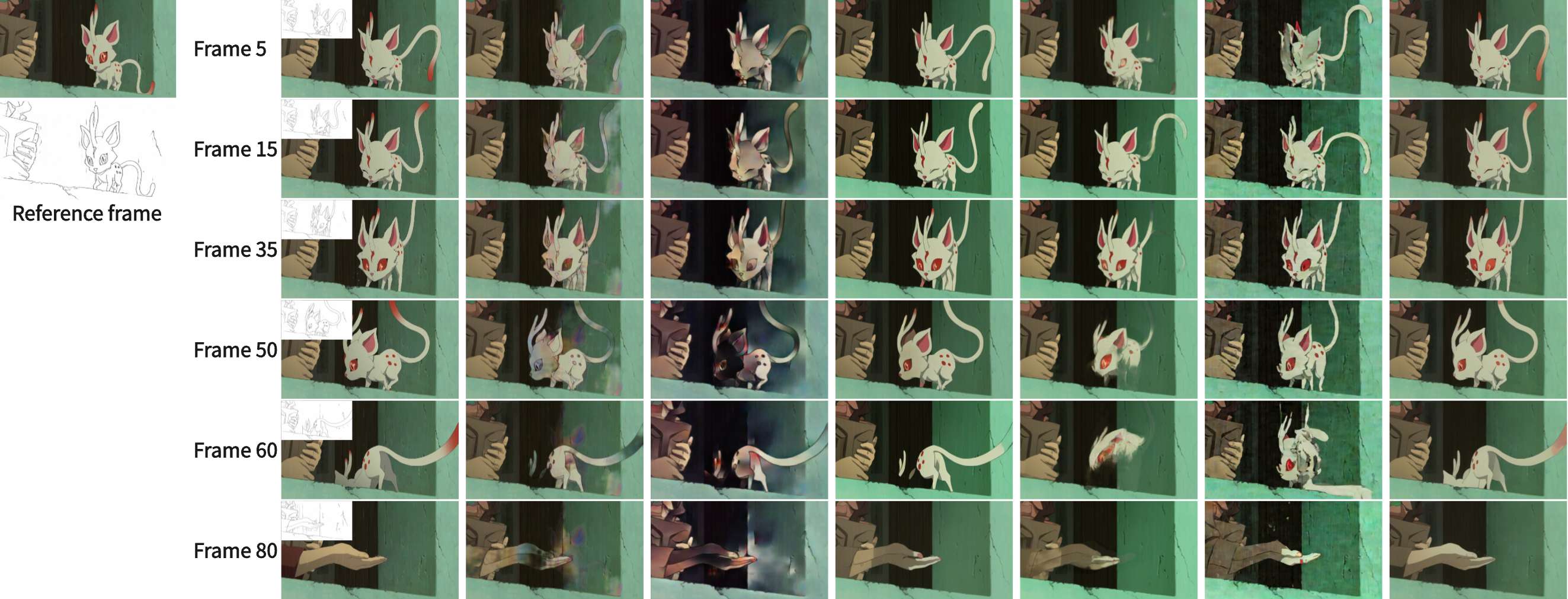 本文方案利用具有长范围空间匹配的基于视频的扩散模型,通过参考注意力,能够生成具有大运动的长期时间一致的动画。例如,在所有示例中,当精灵和角色改变位置时,我们的方法能够准确找到正确的对应关系并有效地对其进行上色。此外,通过结合重叠混合和前参考注意力的顺序采样,我们的方法能够保持长期时间一致性。正如第二个示例中精灵的尾部和第一个示例中生成的头部(不在参考帧中)所证明的,相似的颜色在整个动画中得以保留。总体而言,方法成功地实现了对长序列线条的上色,这是以往工作(包括基于CNN和基于扩散的框架)无法实现的。