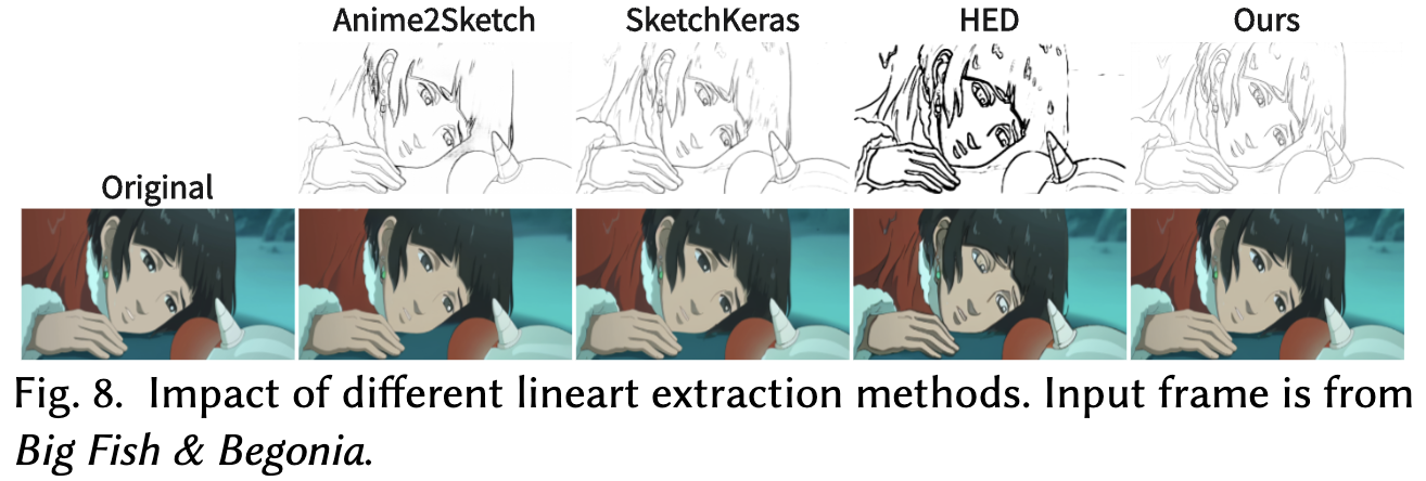 为了评估不同线条提取方法的影响,将训练使用提取的线条的模型应用于使用多种提取方法生成的线条上,包括Anime2Sketch、SketchKeras、HED(使用来自所有层的组合特征)以及我们训练数据集中使用的方法。如图8所示,尽管与我们训练中使用的线条在风格和细节上存在差异,我们的模型仍能为Anime2Sketch和SketchKeras提取的线条生成类似质量的结果,展示了我们方法的通用性。然而,当应用于线条过于粗厚的HED提取线条时,我们的模型倾向于生成粗糙且模糊的动画。这个问题可以通过用不同厚度的线条增强训练数据来解决。