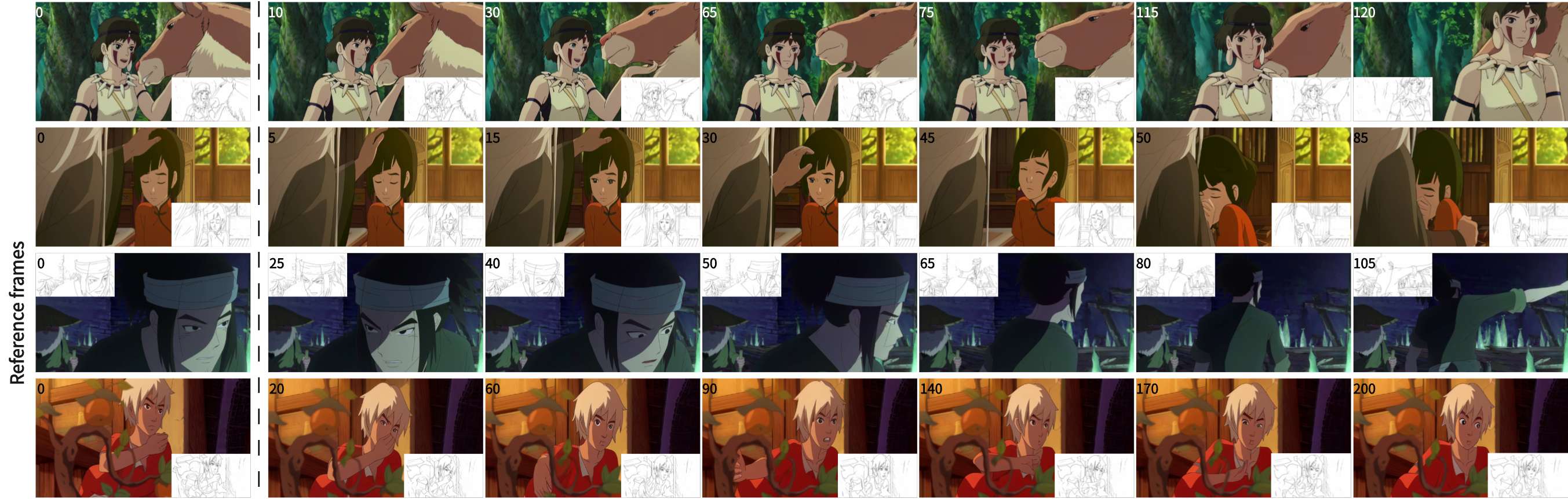 测试数据集。 选择了四部宫崎骏执导的电影,分别是《哈尔的移动城堡》、《红猪》、《幽灵公主》和《千与千寻》,作为我们的测试集,标记为“相似测试集”,这些电影展现了相似的艺术风格,但内容与训练数据集不同。此外,为了评估我们模型在不同动画风格和内容上的泛化能力,我们选择了三部其他导演制作的电影,包括《大鱼海棠》、《喵小咪》和《罗小黑》,标记为“通用测试集”。将视频分割成片段,并使用与训练数据集相同的方法提取线条草图。对于每个测试集,均匀选择1,000个视频片段进行评估,平均长度为59帧。使用分辨率为256 × 256的光流来测量两个测试集的平均运动,其中排除了静止位置。发现55%的片段的平均运动超过5个像素,28%的片段超过10个像素。