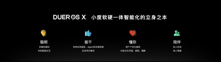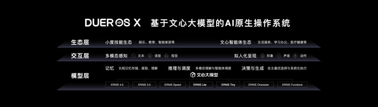 全球首个AI原生操作系统DuerOS X,DuerOS作为小度的核心产品服务能力基座,基于百度文心大模型重构,升级为全新的AI native OS;