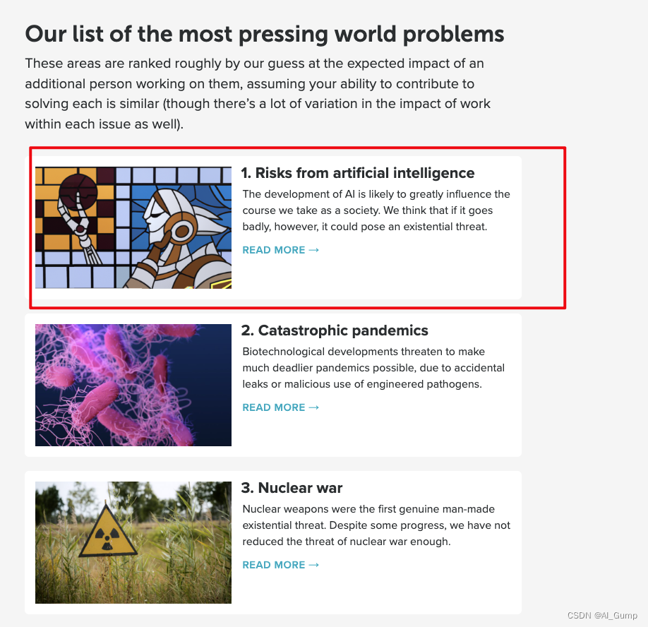 笔者曾在2018年接触过一个公益组织—— 80000小时,(牛津大学未来人类研究所旗下的非盈利组织,通过指明世界上人类文明延续所面临的几大危机,来指导学生就业)AI安全问题当时已经位居前3(其他top2 为 气候危机和全球性流行病)