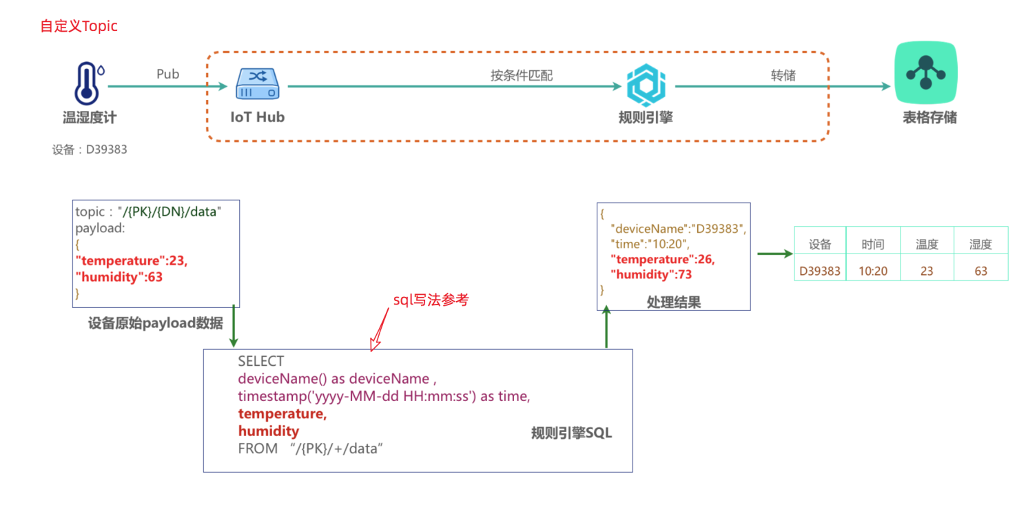 设备接入IoT物联网平台后,最佳获取数据的方式就是通过规则引擎,先使用SQL表达式处理数据,再流转到DB,MQ,DataHub,FC等目的地。配置数据处理SQL时,我们需要了解每个topic对应的数据格式,才能写出正确的SQL表达式。