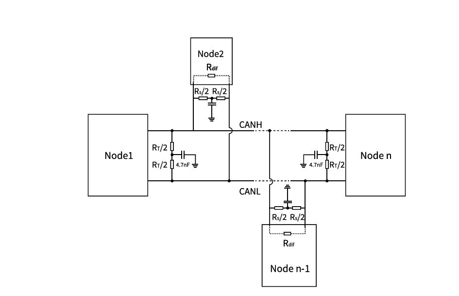 总线负载电阻在45Ω~70Ω范围之间,提升总线的抗干扰性能,因为CAN 收发器的输入差分电阻阻值为几十kΩ,在总线隐性状态下,外部的一些轻微干扰通过几十kΩ的电阻就有可能在总线上产生满足显性的差分电压,改变总线状态,所以需要在总线处并联一个阻值较小的电阻来吸收外部的一些干扰,同时考虑到CAN收发器的总线输出电压范围,并联的电阻值应使得这一节点的外部等效负载电阻在45Ω~70Ω之间。