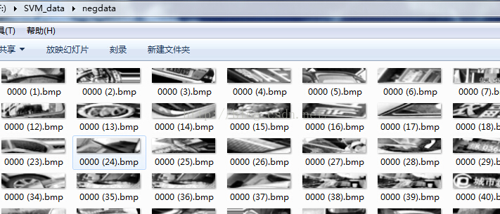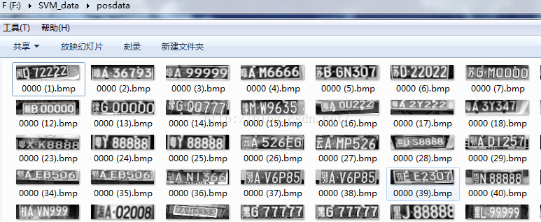 首先我将一系列图片进行图像预处理、分割等一系列步骤,这部分内容可以参看《深入理解opencv 使用计算机视觉项目解析》,这样从中挑选出100个正样本(车牌区域)和70个负样本(非车牌区域),大小均为144*33,分别存放于目录F:\SVM_data\posdata与F:\SVM_data\negdata,如下所示: