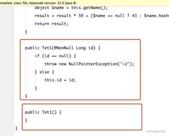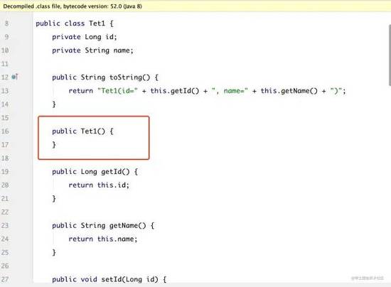 编译后的class为:可以看到不仅帮我们生成了get和set ,同时也有默认的无参构造器