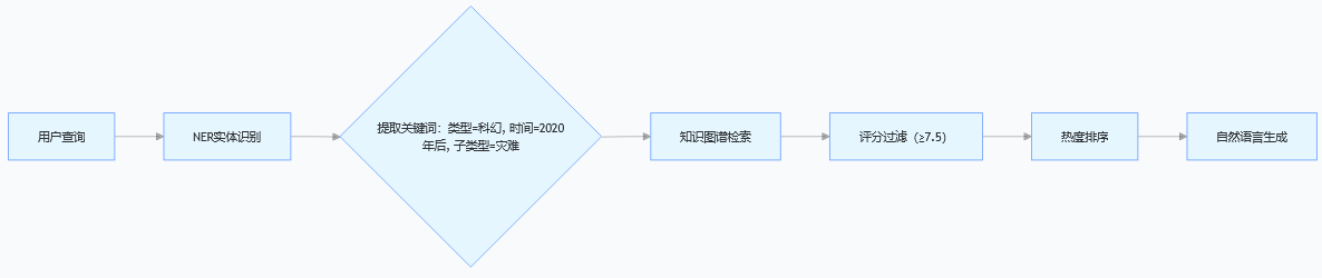 1.解析类型 / 标签关键词 → 2. 检索匹配影片 → 3. 筛选评分 / 年份 → 4. 生成个性化推荐