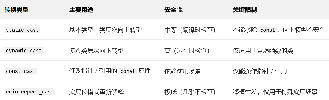 - 虚函数重写:派生类重写(覆盖)基类中的虚函数(函数名、参数列表、返回值必须完全一致,协变返回值除外);