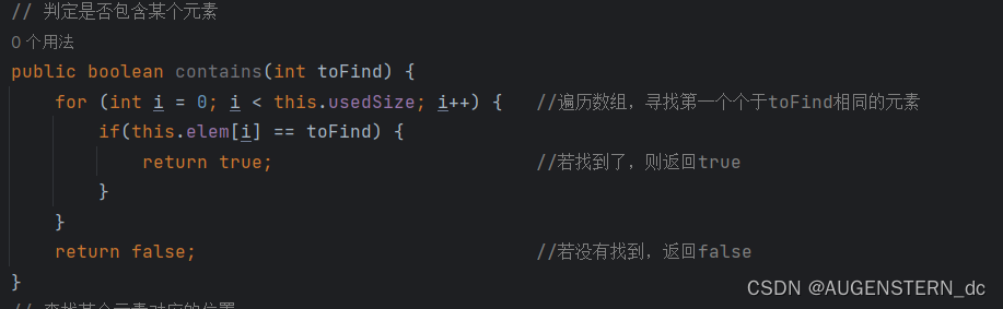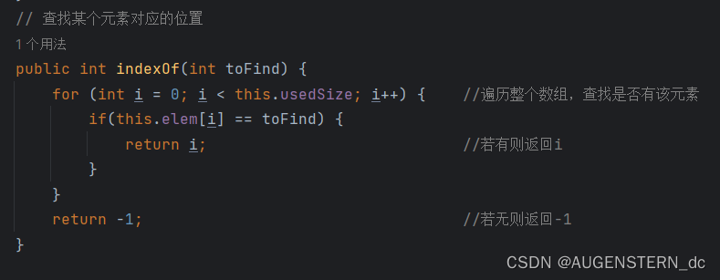 for (int i = 0; i < this.usedSize; i++) { //遍历数组,寻找第一个个于toFind相同的元素