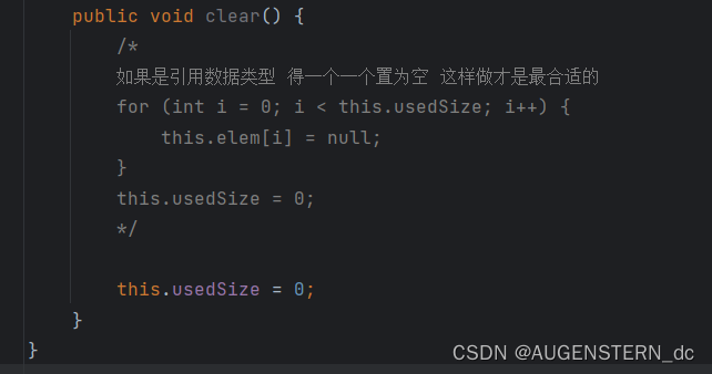 // this.elem[usedSize] = null; 如果传入的参数是引用类型 这里需要置为空