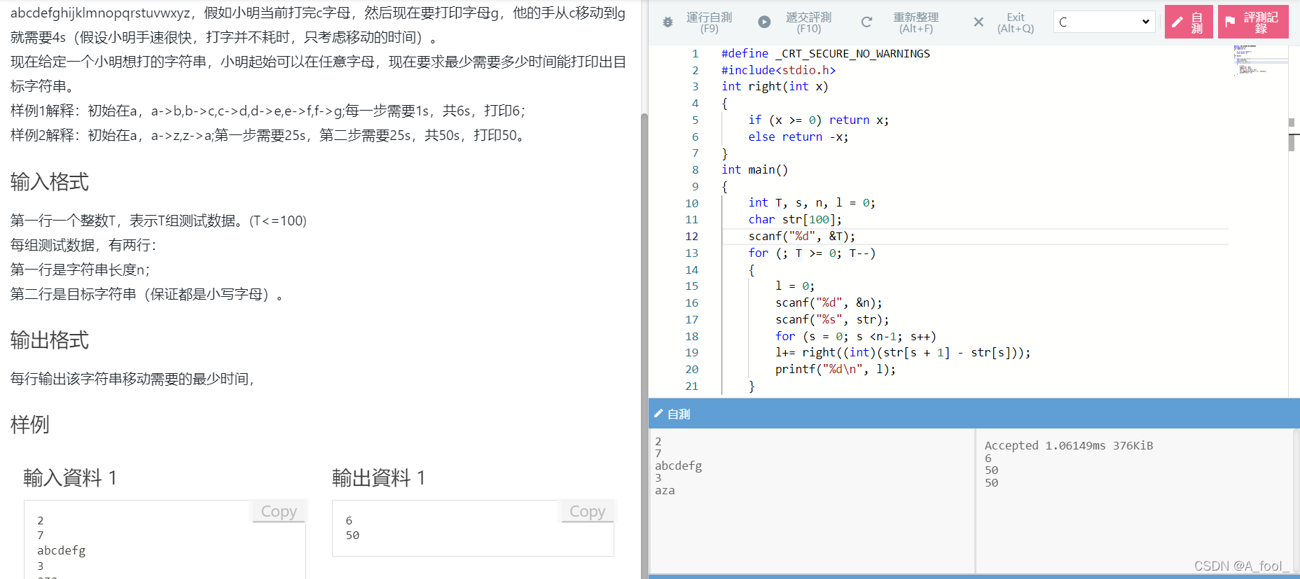 写在回头想想也挺简单的,主要思路就是抓取到每个输入字符的location,在相减取绝对值之和,当时还不知道用abs(毕竟是个萌新hhh),就自己写了个函数来实现.