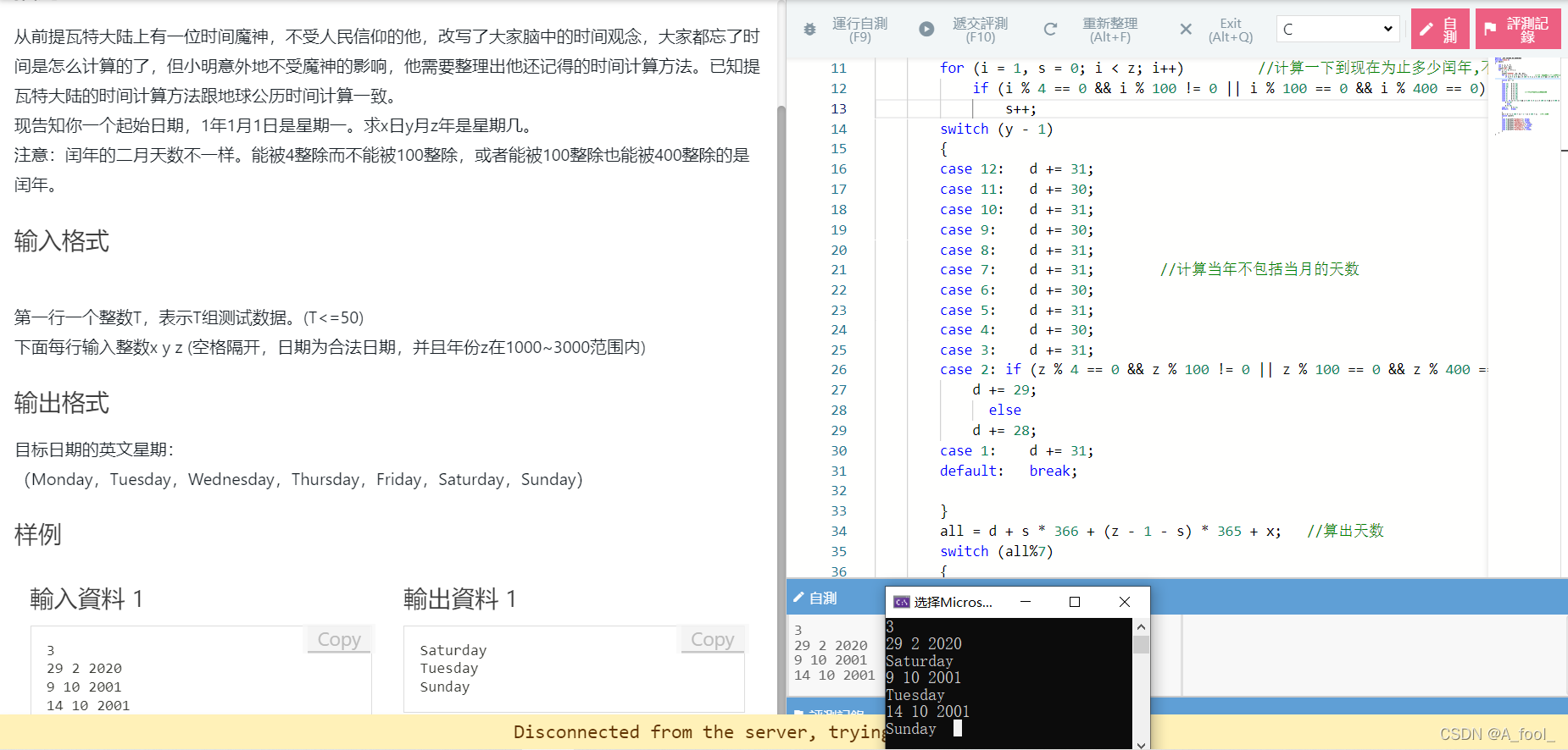 第二题也没什么难度,拿到第一反应就是把算出总天数然后对七取余用switch输出即可,写到中间的时候才发现会有一点巧妙的地方,对,就是算当年具体的天数,因为不知道当年是否是闰月,就要分好俩种情况,加上不知道具体是几月,硬分的花代码会很长,当然小姚是个懒狗,代码能少一行坚决不多写一句. 这里巧妙的运用了switch的语句执行顺序的特点来从而避免细分到每个月.不过个人觉得不是最优解,不知道有没有大佬给个更简便的思路