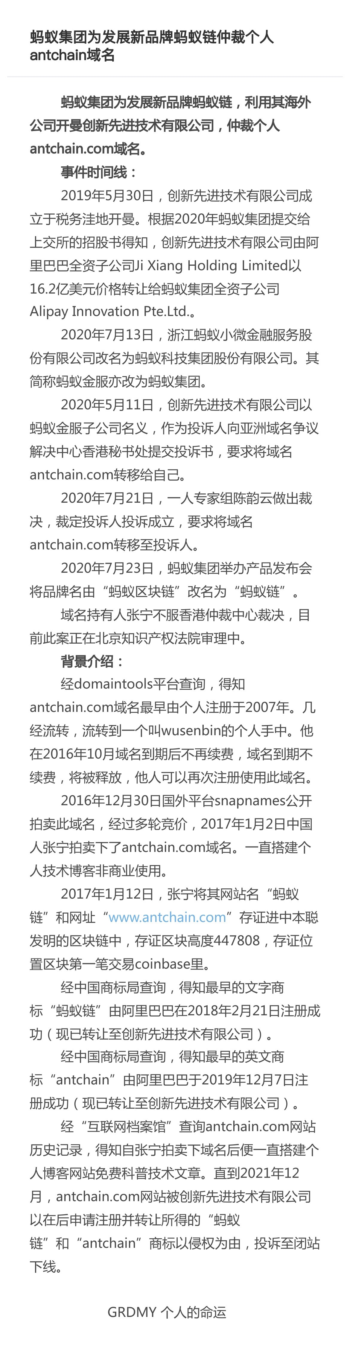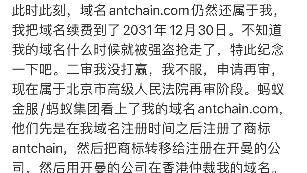 此时此刻,域名antchain.com仍然还属于我,我把域名续费到了2031年12月30日。蚂蚁金服/蚂蚁集团看上了我的域名antchain.com,他们先是在我域名注册时间之后注册了商标antchain,然后把商标转移给注册在开曼的公司,然后用开曼的公司在香港仲裁我的域名。然后马云“白加道”豪宅的邻居陈韵云作为裁判,把我的域名antchain.com判给了蚂蚁金服/蚂蚁集团在开曼的白手套公司开曼创新先进技术有限公司。如果某一天我失去了我的域名,那么请互联网记住,强盗为了得到我的域名使用的卑鄙手段。