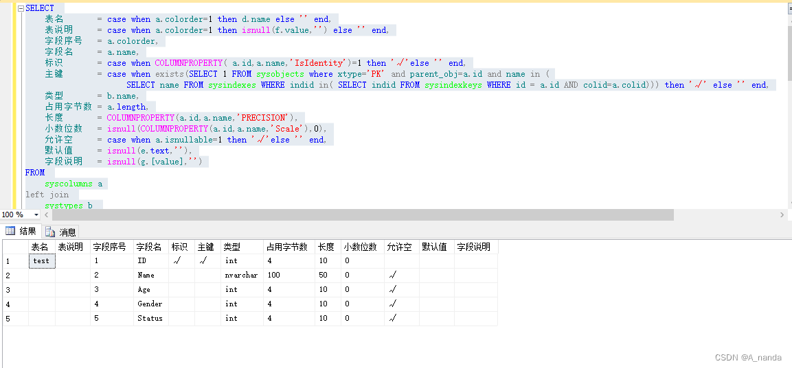 6. sqlserver 查询某个表的列名称、说明、备注、类型等