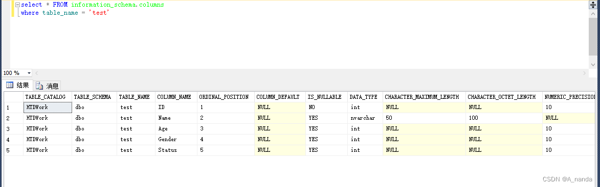 ------查询一个表的所有信息 select * FROM information_schema.columns where table_name = 'test'