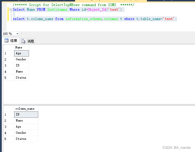 ------查询一个表的所有列名,字段的注释 SELECT A.name AS table_name, B.name AS column_name, C.value AS column_description FROM sys.tables A INNER JOIN sys.columns B ON B.object_id = A.object_id LEFT JOIN sys.extended_properties C ON C.major_id = B.object_id AND C.minor_id = B.column_id WHERE A.name = 'test'