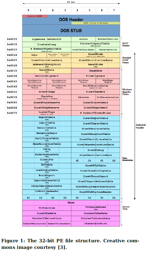 - 标头信息,从COFF标头中, 提取时间戳,target machine、list of image characteristics,在可选标头中提取目标子系统,DLL特性、主要和次要映像版本、file magic、链接版本、系统版本、子系统版本以及代码,头和commit的大小。在训练前使用哈希算法散列特征