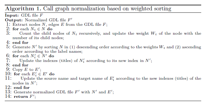 基于加权排序的调用图归一化方法,其中根据节点的子节点数和标签名称(当子节点数相等时)对节点进行重新排序
