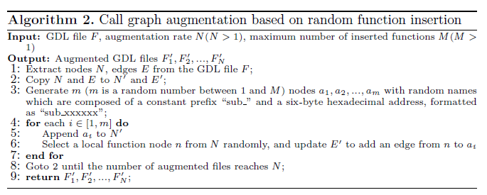 提出一种基于随机函数插入的调用图扩充方法,用于模拟恶意软件的变种行为(随即插入叶结点),将训练数据集扩大数十倍
