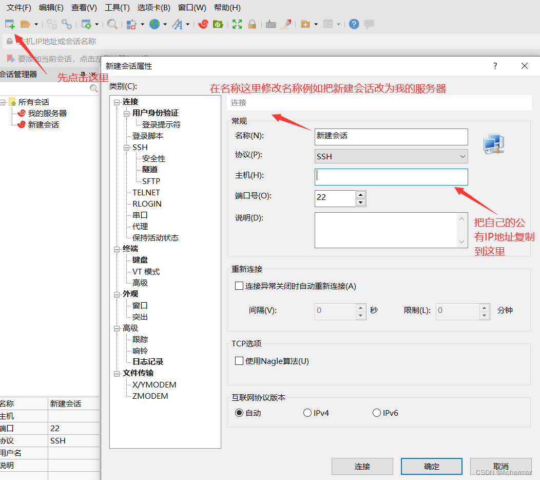 使用 XShell 远程登陆到 Linux 点击链接后发现连接不上不上服务器了,意思就是链接主机断开了,原因可能是因为被杀毒软件拦截了,此时关闭你的杀毒软件再重新点几次链接试试(本人有次链接很久链接不上去,最后把火绒安全软件关了,最后还把防火墙和广告拦截都关了才连接上)还有网络可能不太好,断网了此时多点几次链接,或者换个网再多点几次链接试试。此时输入自己的用户名,它会跳出一个会话框让你输入root的密码,输入后就可以进行操作了。此时它会跳出这样一个界面,往后输入自己的密码,确认后回车,再次输入自己的密码回车。输入adduser 用户名。