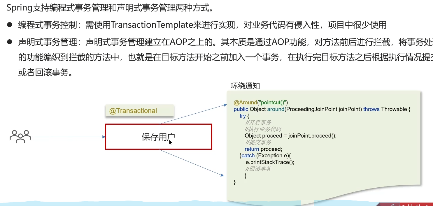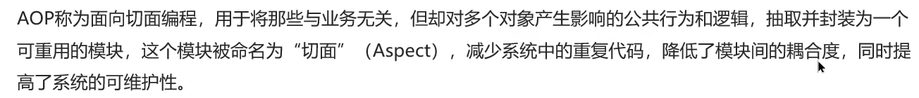 面向切面编程(AOP),在面向对象编程(oop)思想中,我们将事物纵向抽成一个个的对象。而在面向切面编程中, 我们将一个个的对象某些类似的方面横向抽成一个切面,对这个切面进行一些如权限控制、事物管理,记录日志等 公用操作处理的过程就是面向切面编程的思想。AOP 底层是动态代理,如果是接口采用 JDK 动态代理,如果是类 采用 CGLIB 方式实现动态代理。