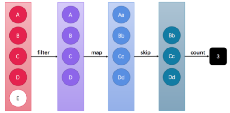 这张图中展示了过滤、映射、跳过、计数等多步操作,这是一种集合元素的处理方案,而方案就是一种“函数模 型”。图中的每一个方框都是一个“流”,调用指定的方法,可以从一个流模型转换为另一个流模型。而右侧的数字 3是终结果。