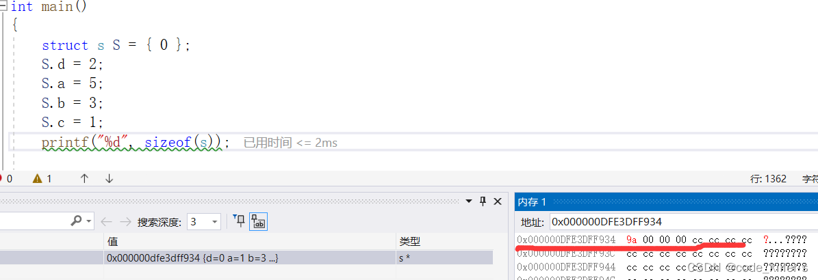 我们知道了字段后面的数字对应的是bit,所以共有15bit,一个字节8bit,所以要2字节 才能存储下,但由于内存对齐,大小必须是结构中最大对齐数的整数倍,结构中最大对 齐数是4(int),所以此结构的大小要对齐到4