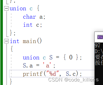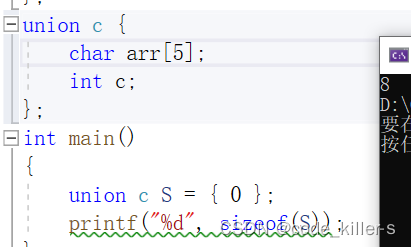 可以看到,char类型数组有5个字节,int类型有4个字节,因为联合体空间是共用的,所以我们取较大值,当然,在联合体中也存在内存对齐,大小位变量中最大对齐数的整数倍,这里的变量最大对齐数是int字节,所以此联合体的大小为8