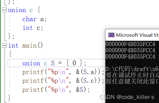 由此看出,联合体的成员是共用一块空间的,他们的地址都一样,且改变一个变量时,另一个变 量的值也会随之改变,故在联合体中,不能同时改变两个联合体变量的值