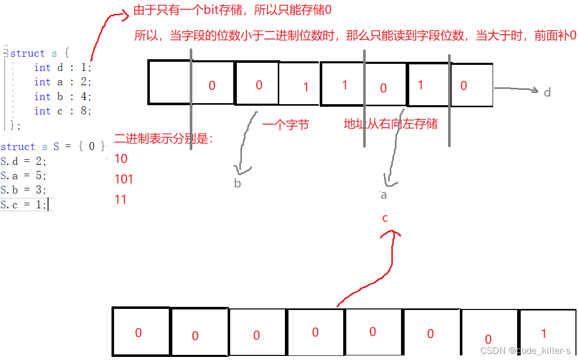 2.当位段的个数小于一个8bit位时,剩余的空间会被下面的位段继续使用,不会浪费