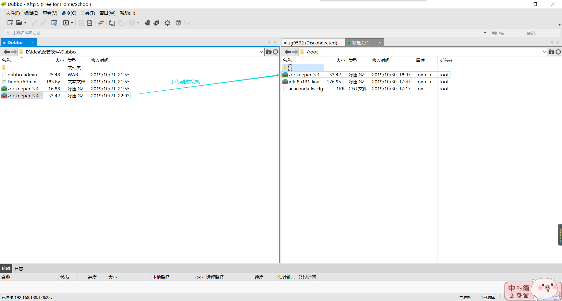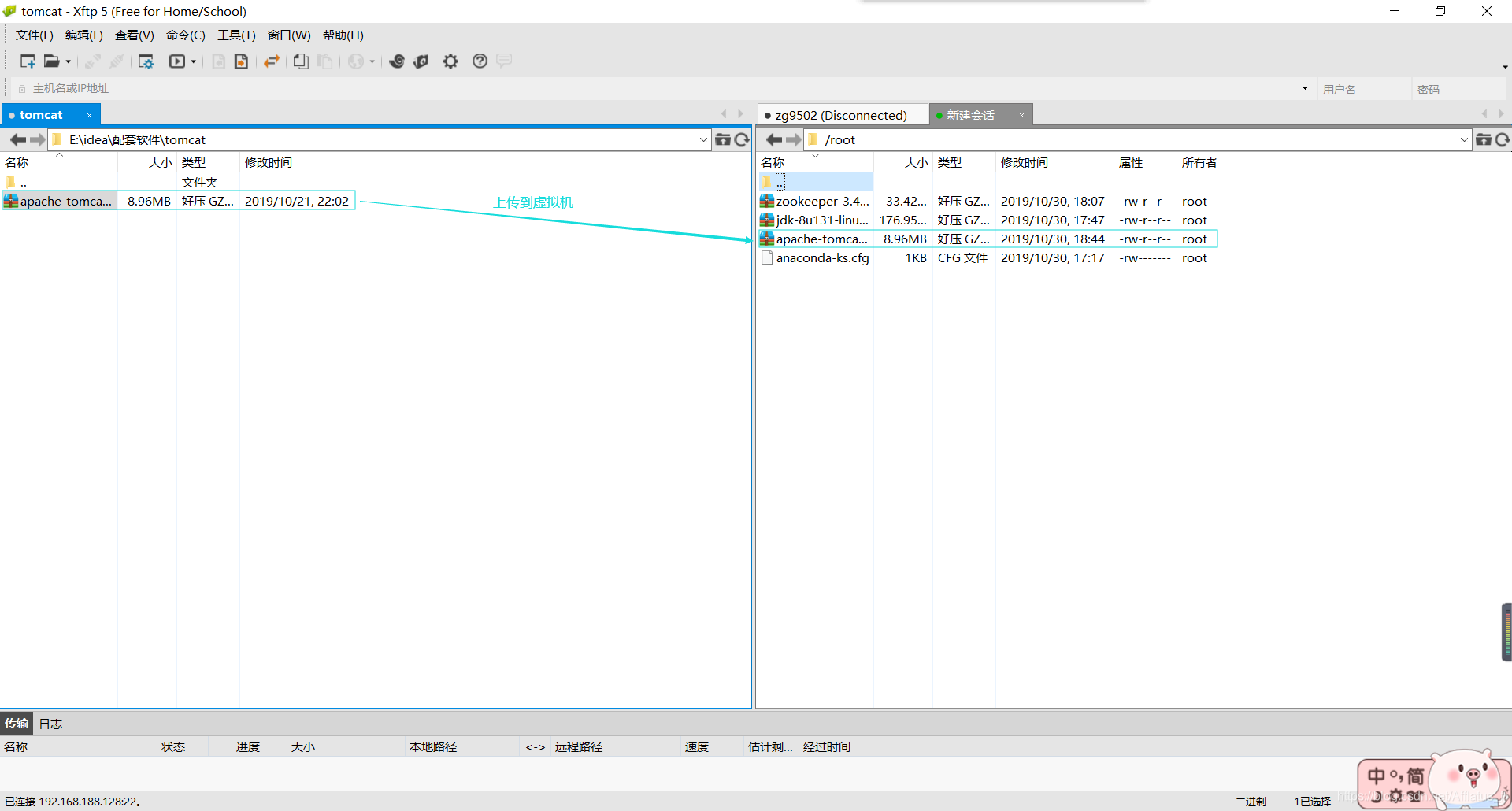 - 使用工具(xftp)连接虚拟机,将安装包上传到虚拟机中