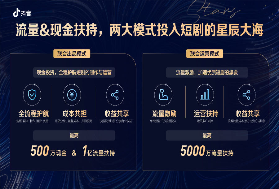 短视频平台是最早的入局者。2019年,快手推出 "小剧场" 模块,后续通过"光合计划""星芒计划"提供流量与现金扶持,对优质短剧的参投比例最高达50%,单部剧可获6000万流量倾斜;抖音则推出"辰星计划""千万爆款剧乐部",最高投入500万现金+1亿流量,还通过联合出品模式全程护航制作。